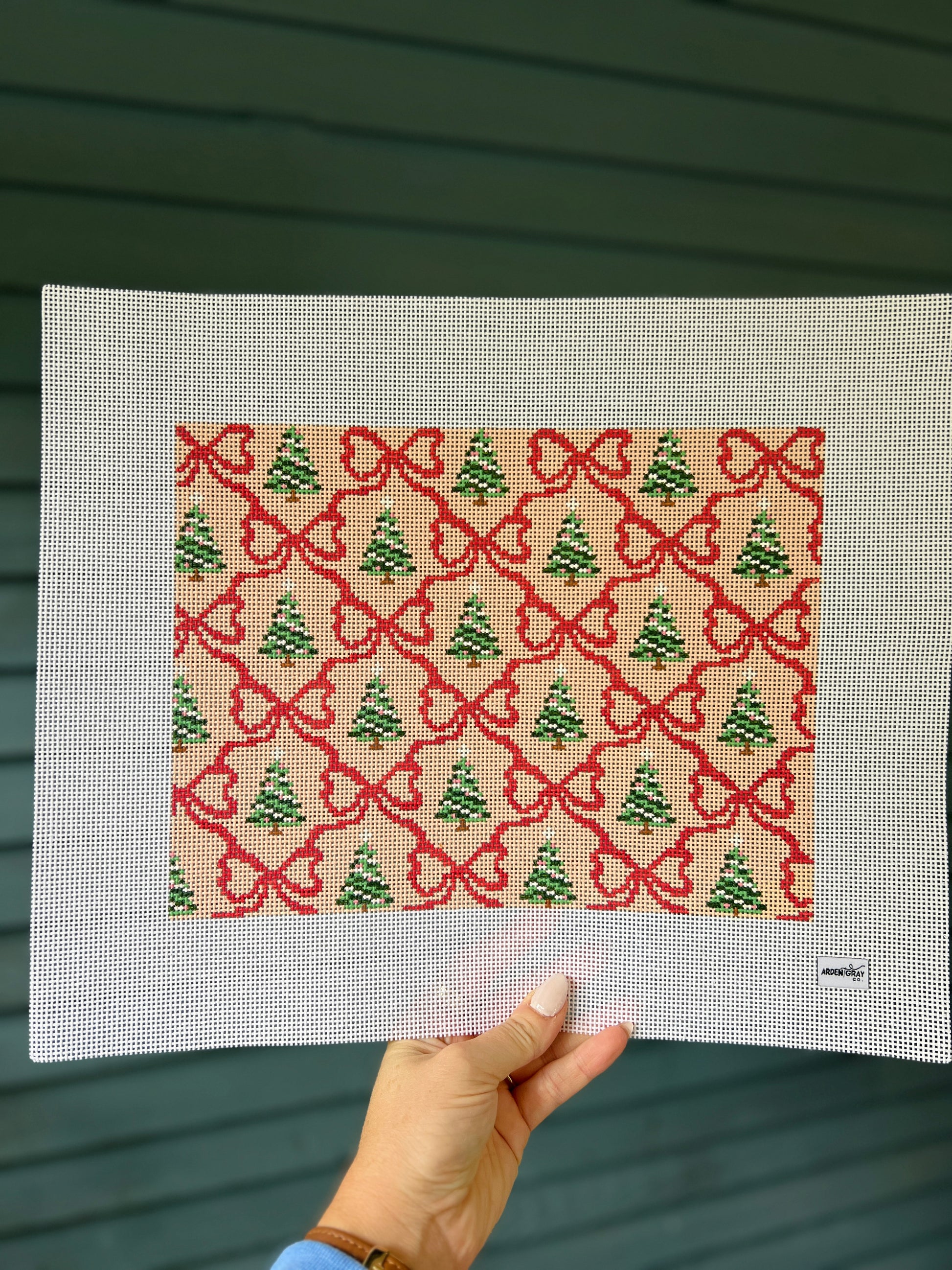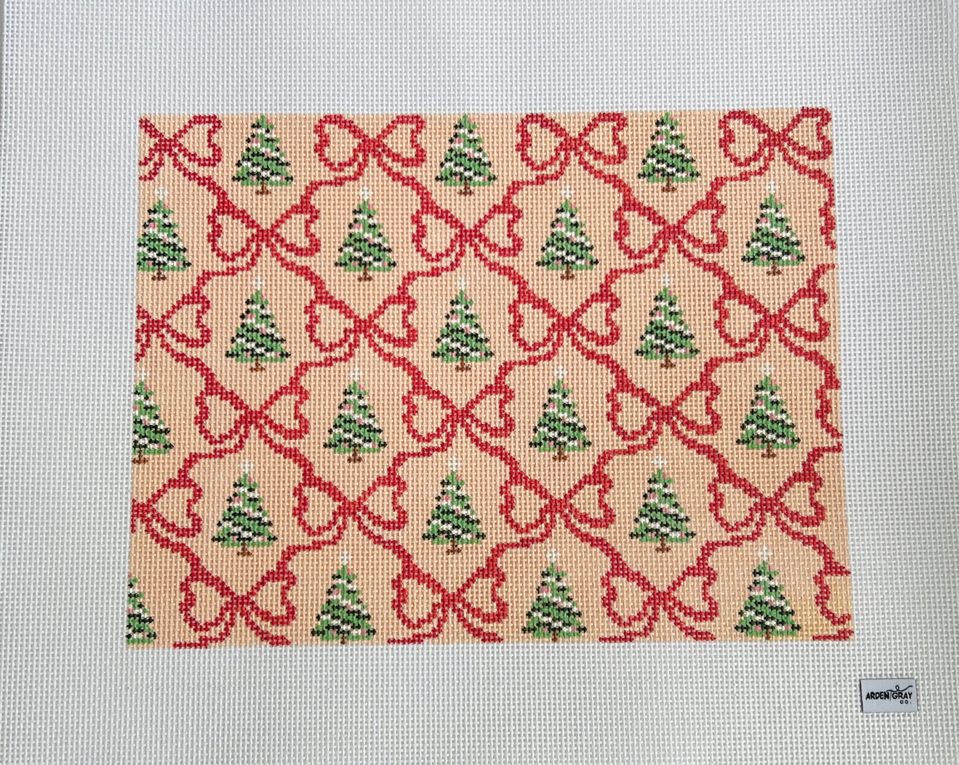 Holiday bows and trees tray or pillow hand-painted needlepoint canvas by Arden Gray Co.