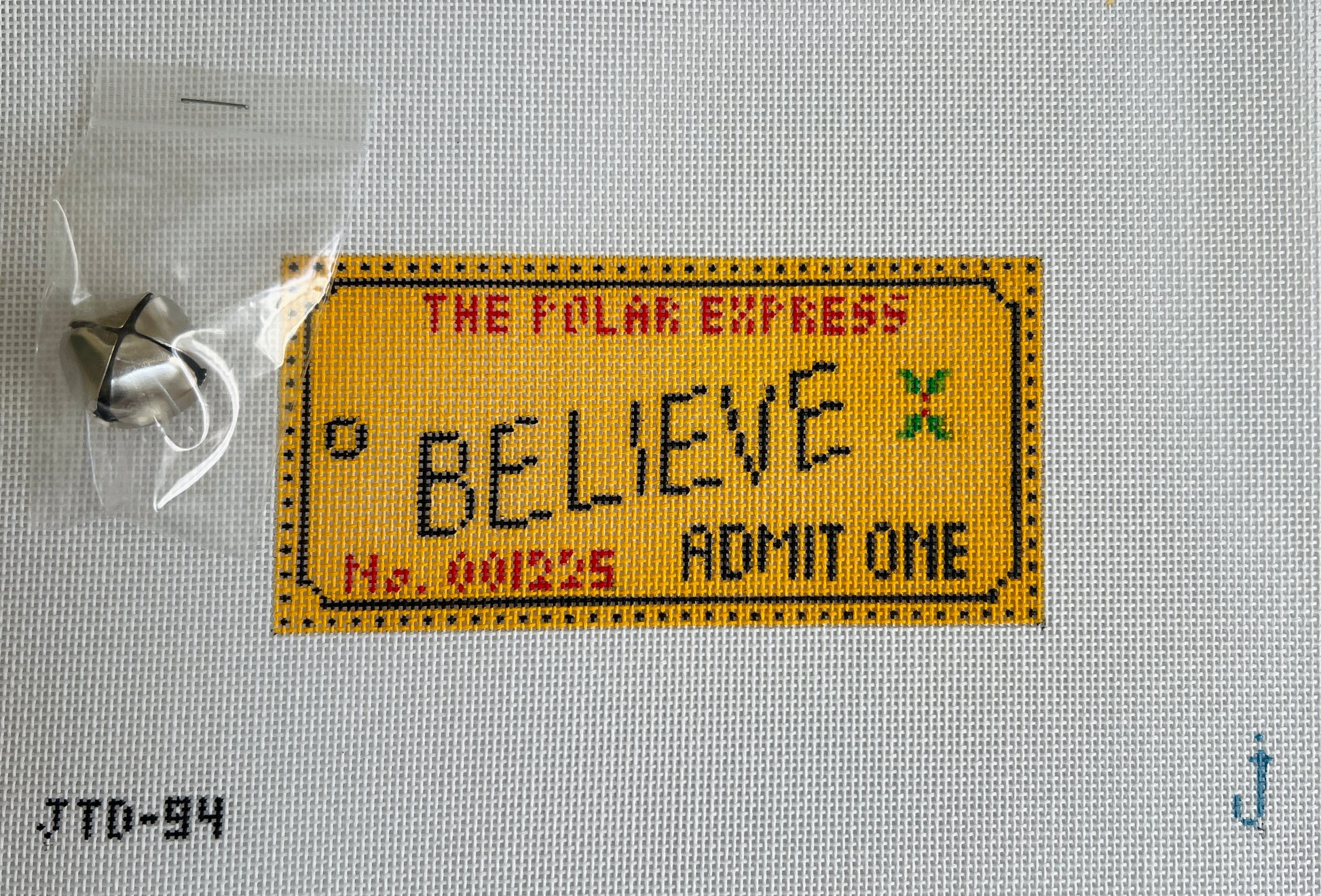Polar Express Ticket Needlepoint Canvas with bell by Jessica Tongel Designs