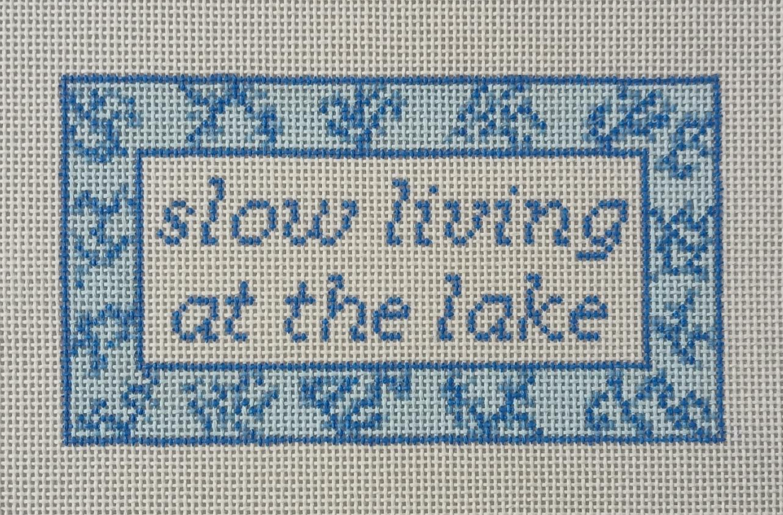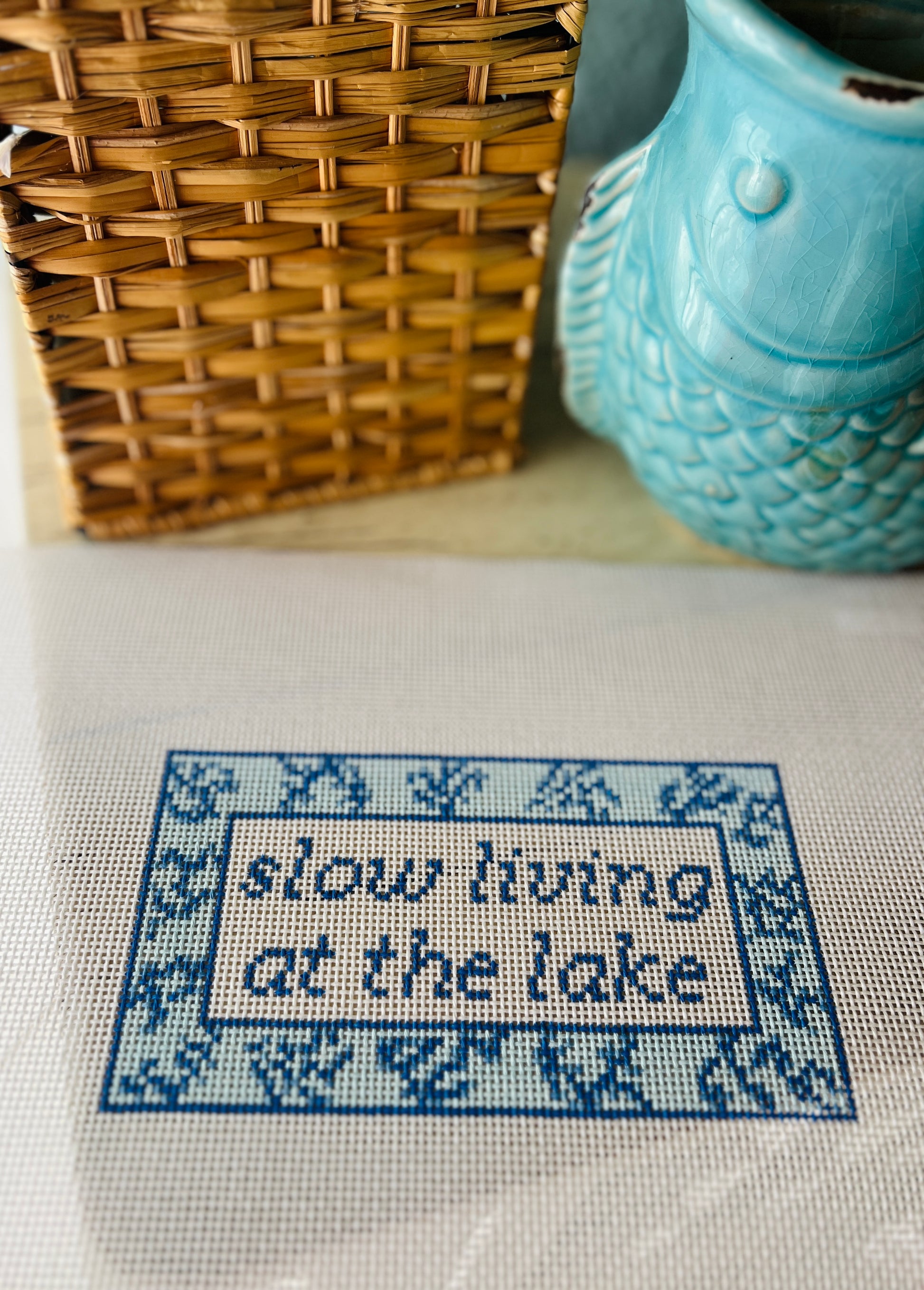 Slow Living at the Lake hand-painted needlepoint sign by Arden Gray Co.